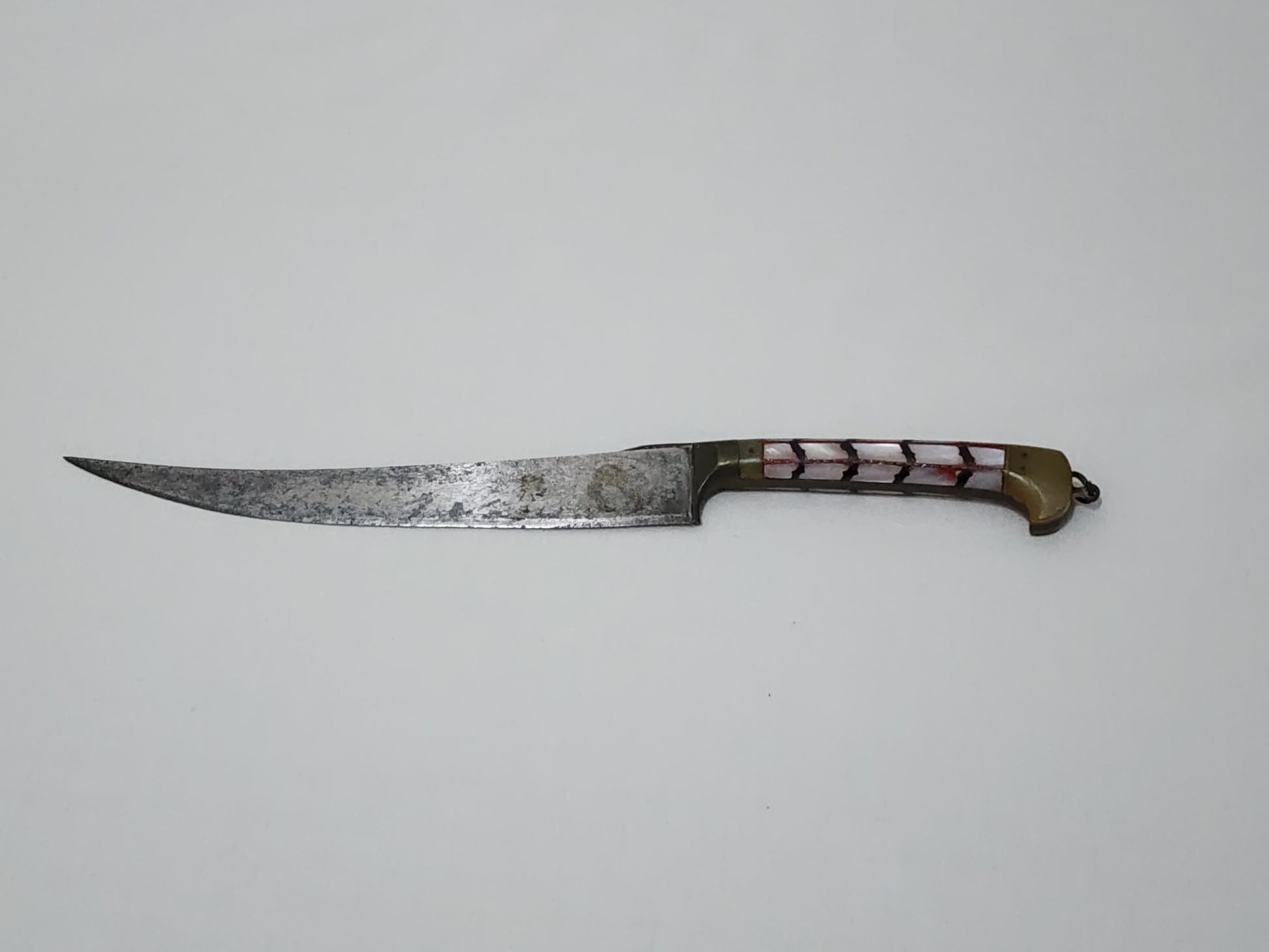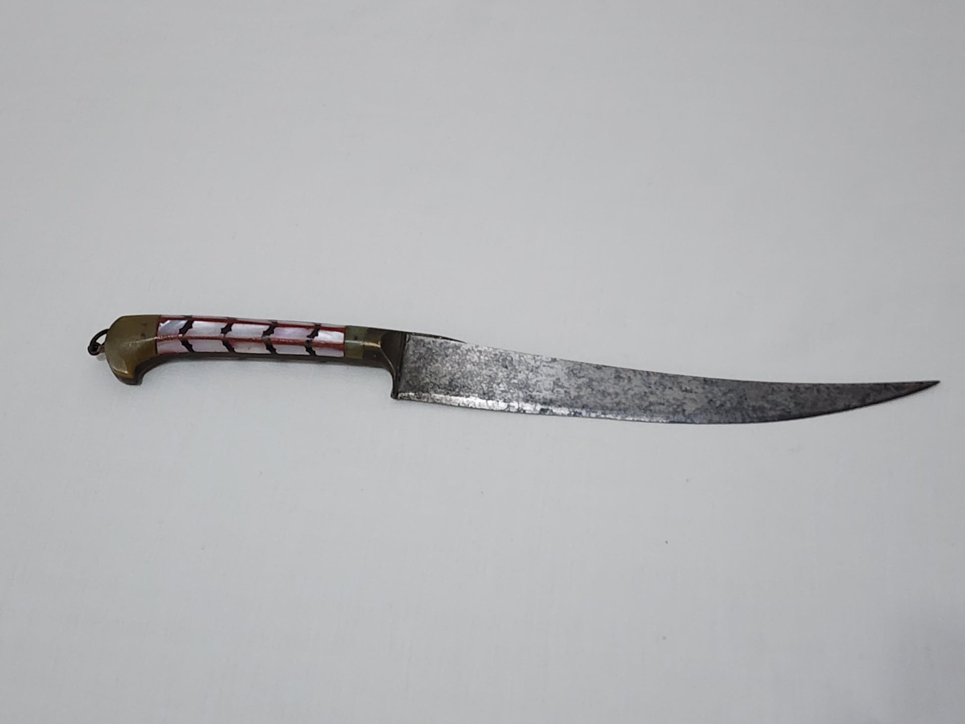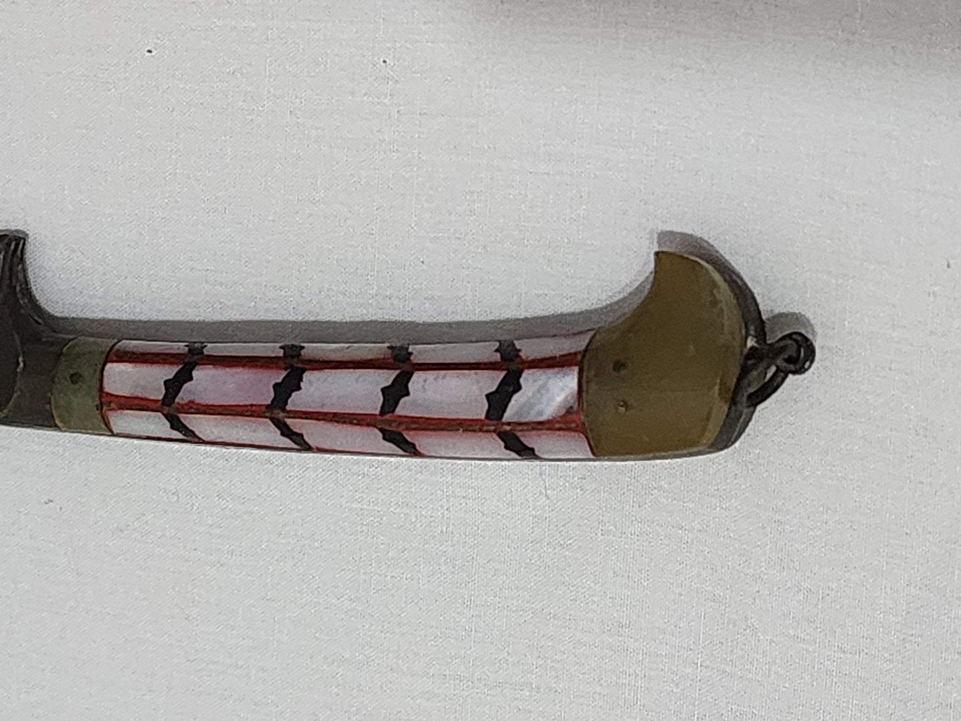 A kard dagger with a hilt embellished with Mother of Pearl scales and green stone. It comes with its original scabbard (still solid and functional). During the late 1800s / early 1900s, there were many blades of such design produced for the European market of varying quality. Such blades included kards, pesh kabz, and Una (a blade approx 30-40cm) possessing the characteristic Mother of Pearl scales with green / white / yellow stone or bone. Some blades were made of standard steel, some with fake 'watering', others with genuine wootz (most likely repurposed from broken sword blades), or Damascus steel. Unusually, this particular piece has a watered blade; it possesses a very sharp edge. A very good example.