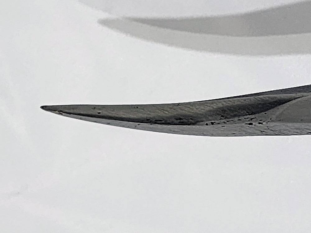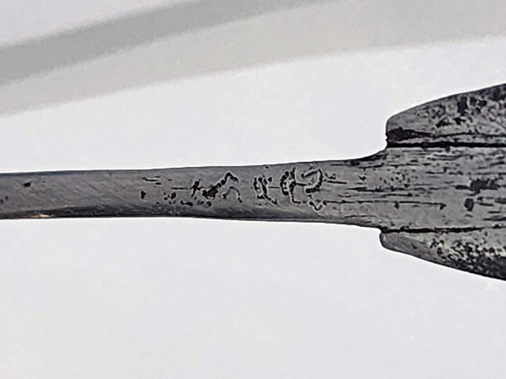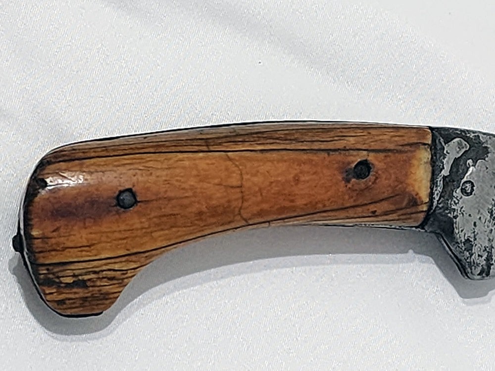 A fantastic and very well-balanced fighting Totapuri Pesh Kabz from Rajasthan. The sharp blade is of wootz with a hilt most likely of ivory; there is minor pitting on the base of the blade but this has no effect on the integrity of the piece. This is a full piece that has not been shaved down. The item is named "totapuri" on account of the characteristic recurve shape of the blade reminiscent of a parrot (a "tota"). The spine of the blade has inventory markings similar to many seen from the famed Bikaner Armoury. The edge is beveled and the tip is bevelled for armour-piercing. No movement in the handle and the scales are very well riveted. A very solid dagger typically kept as a daily "personal" item in the waist belt.