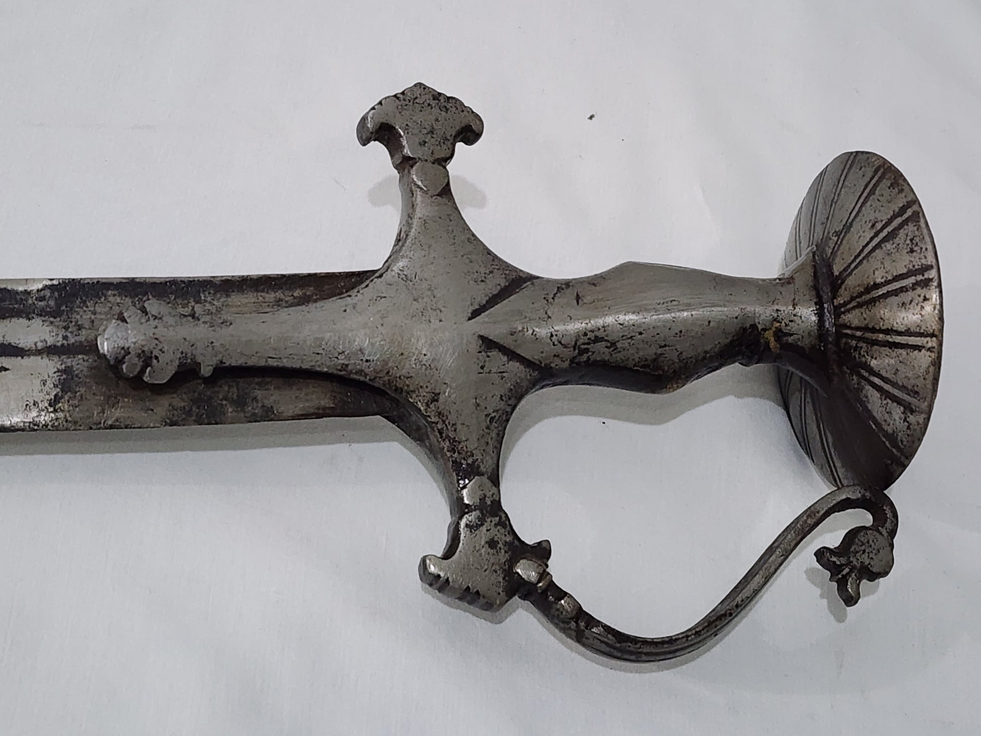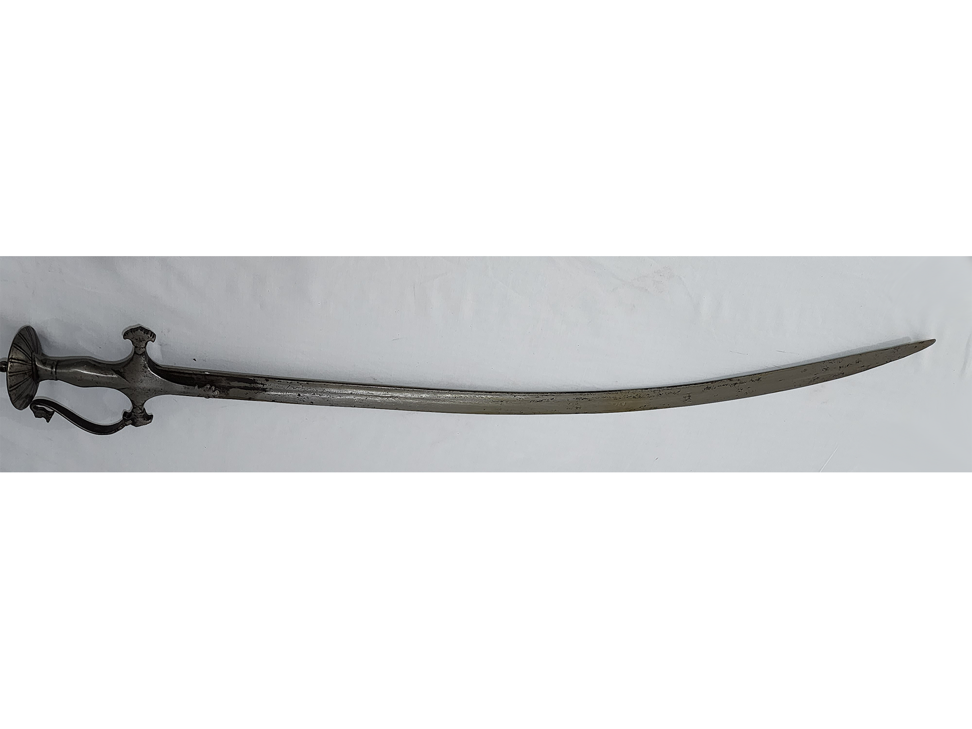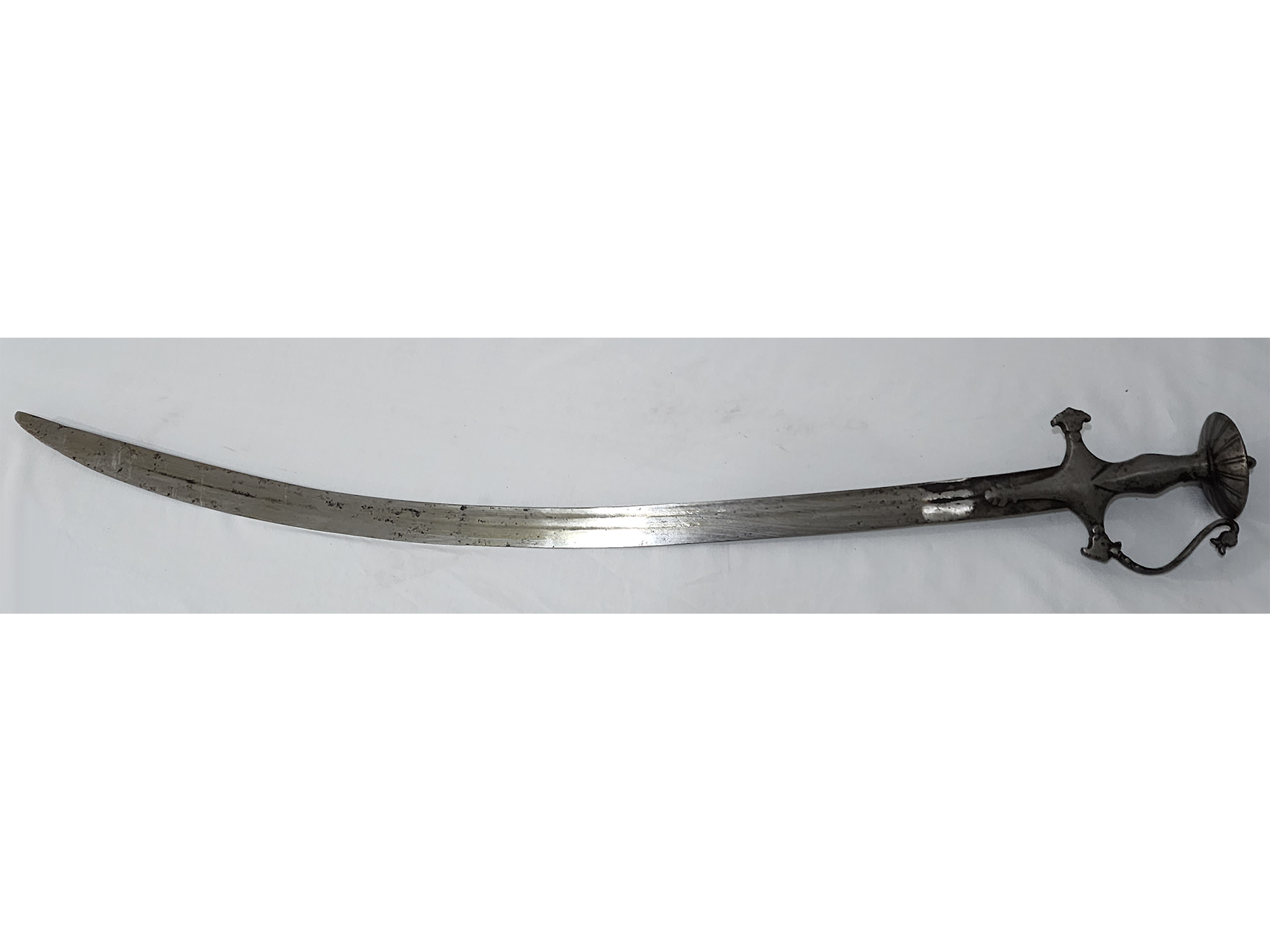 A very good example of a typical North Indian Tulwar sword. There is a sharp back-edge to the blade towards the last 25cm of the blade. The blade is relatively flexible and possesses a clear 'ring' to the blade indicative of blades that are structurally sound. Very well balanced blade with minor wear; the edge is razor sharp. The hilt possesses a solid knuckle guard. This is sword is designed to inflict viciously deep cuts when wielded with the correct body mechanics.