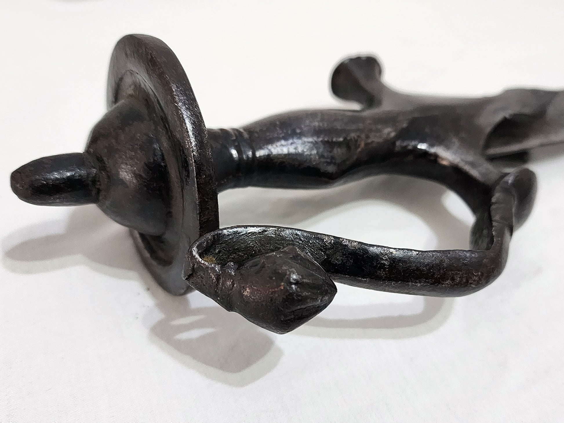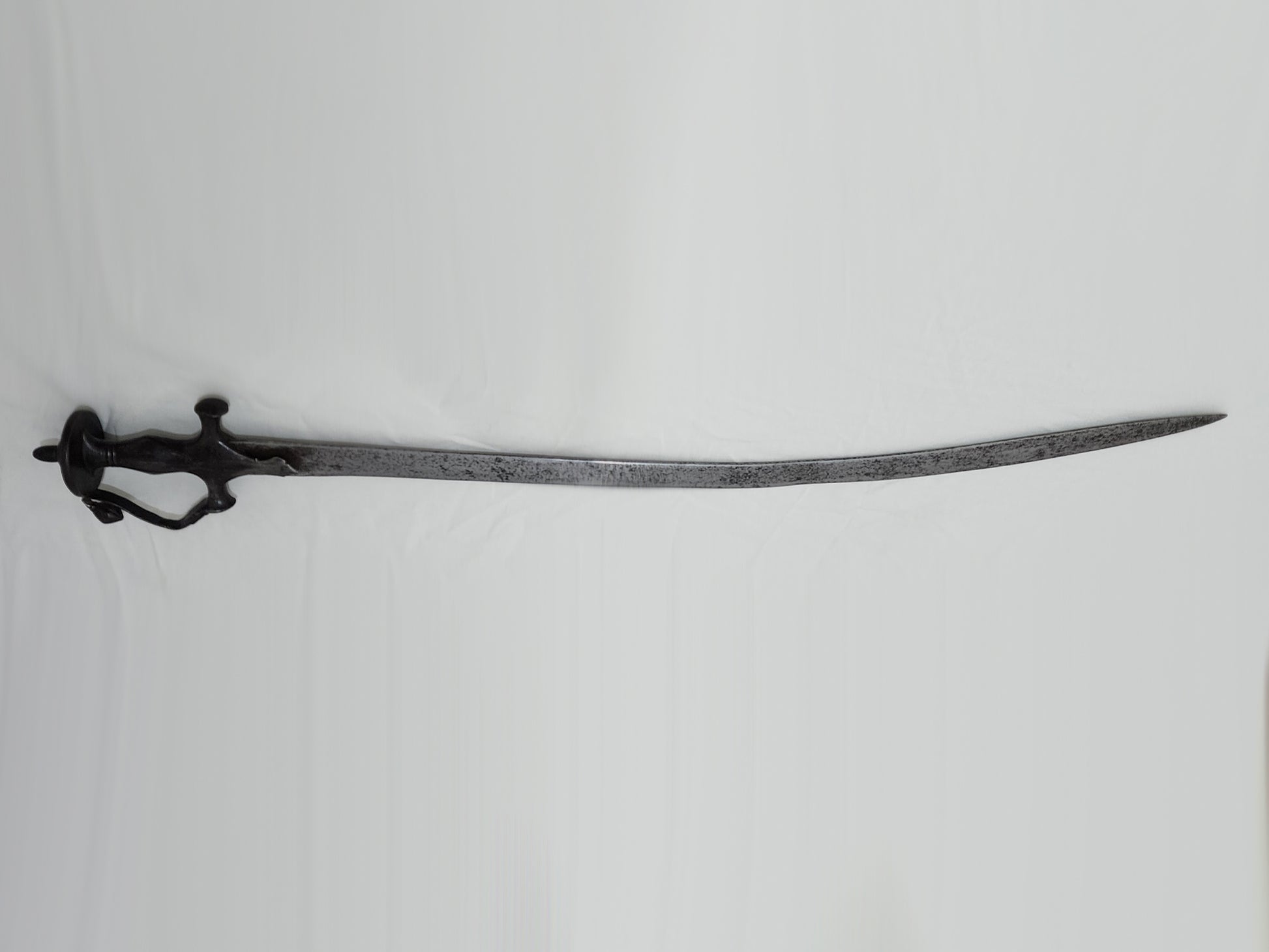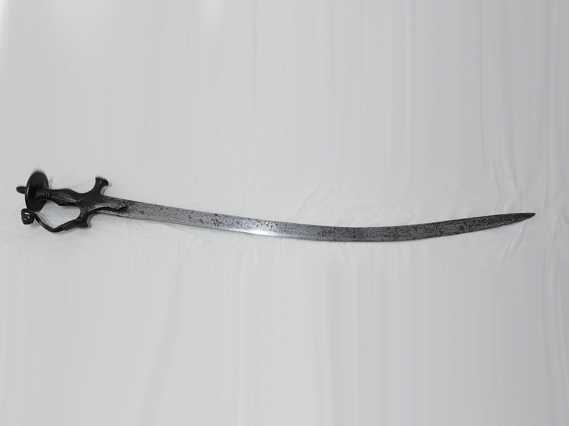 A serious fighting and very functional North Indian Tulwar sword with a high quality wootz blade. A deep cutter with an excellent edge - no dinks or nicks. The hilt retains some silver and has blackened with age. Minor dark patina which is not unusual for such blades; doesn't diminish the balance, weight or structural integrity. Exceptionally well-balanced blade with minor wear; the edge is razor sharp. The hilt possesses a solid knuckle guard terminating with a lotus bud; no movement. This is sword is designed to inflict viciously deep draw-cuts and trust-cuts when with the correct body mechanics. A fine functional piece for someone wishing to progress seriously in Sanatan Shastar Vidiya.
