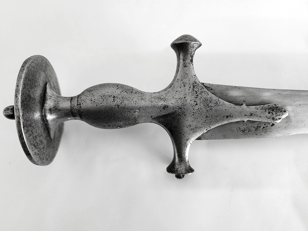 The blade is full length and has not been shaved down nor tampered with; there is very minor surface pitting towards the tip of the blade. The last 10cm of the blade possesses a "false edge" designed for reverse cuts. The hilt appears to show indications of watering (wootz) which is highly likely given the overall quality of the sword.
