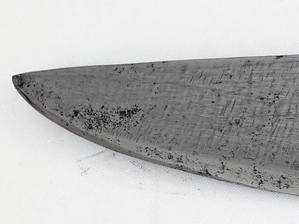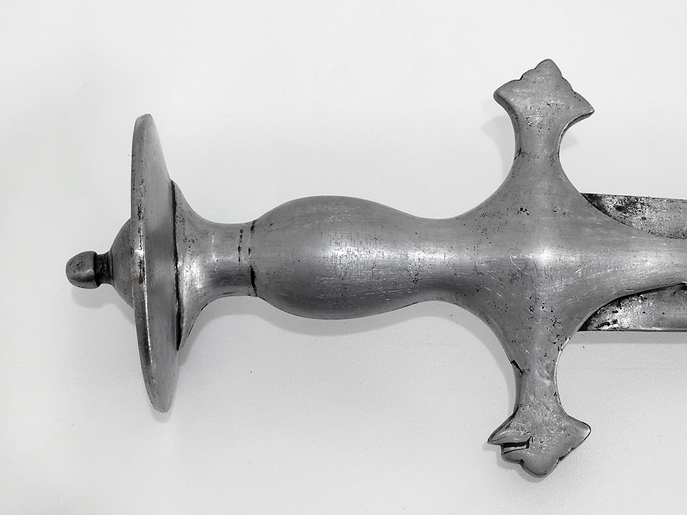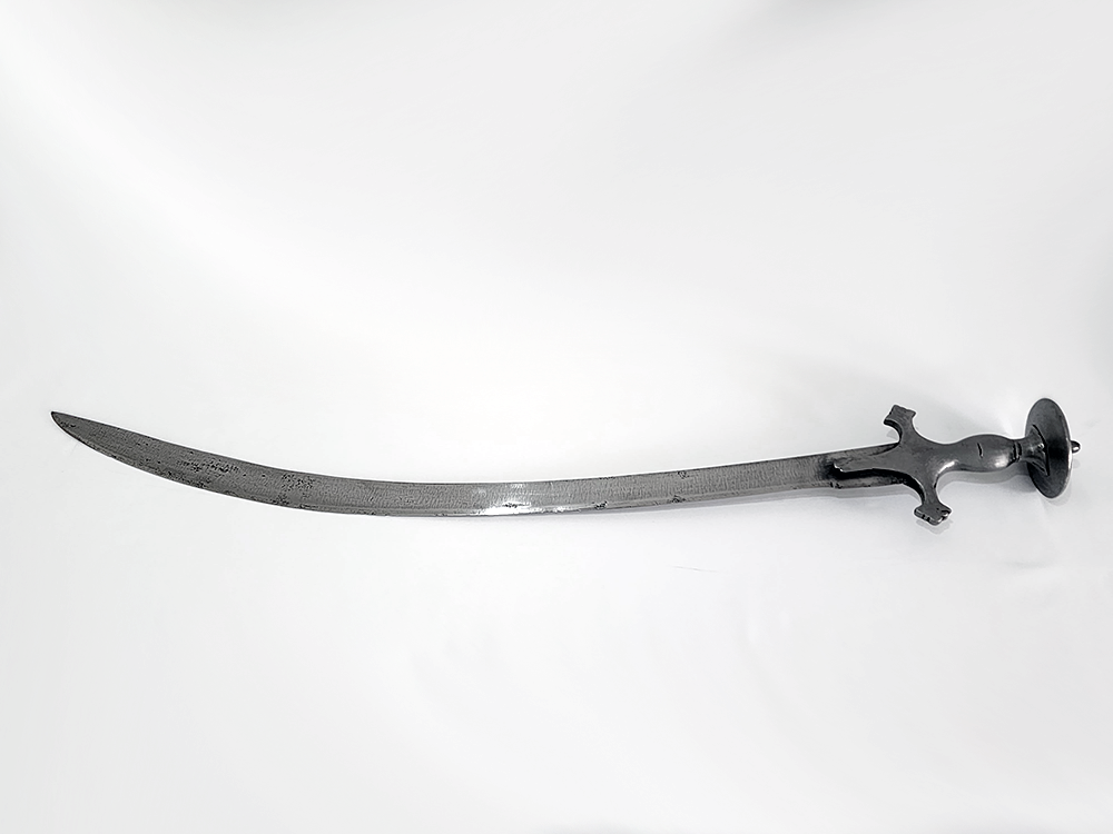 An exceptional Tulwar sword with a wootz blade. The elegant curved blade is full size. The edge is razor sharp, clean, no dinks, and no damage; it retains the original bevelled edge. There is some very minor surface pitting on the polished blade. Spine is of good width, consistent, strong and sturdy. There is a false edge towards the tip of the sword. The sword is very well balanced, extremely dexterous, and sits naturally in the hand. The Tulwar handles immaculately as do all weapons sold at www.shastaragar.com possessing fantastic balance. This sword is ideal for wielding in Nandi Yudhan and the higher Yudhans in Sanatan Shastar Vidiya. This sword, like others on www.shastaragar.com It has featured on demonstration videos previously done by Gurdev Nidar Singh. An opportunity to own a true fighting piece with a deep powerful cut; the sweet spot is at the very base of the sword - a hallmark of real high-end fighting blades. Not one to miss The sword comes with a wooden scabbard covered in black leather; it is in relatively good condition possessing some of the original leatherwork. The tip of the sword has been reinforced with black tape.
