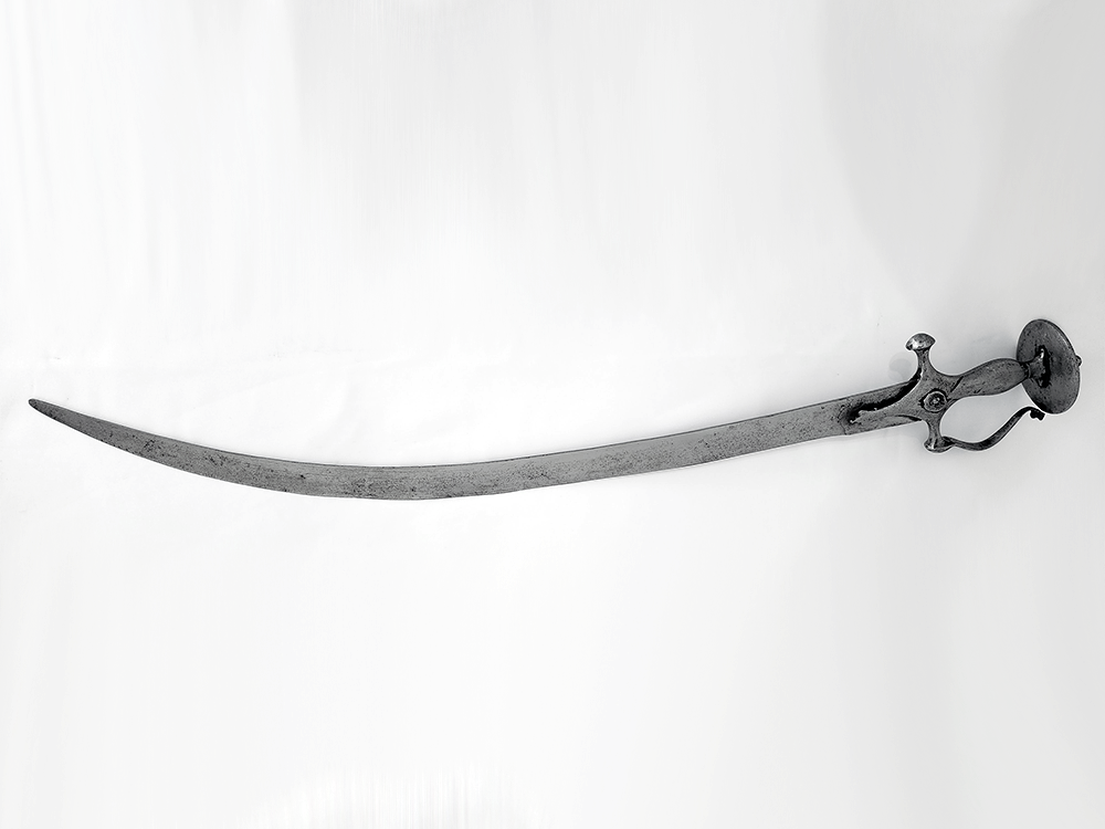 A characteristic curved tulwar with a (wootz?) hilt possessing a finger-guard. The elegant blade is of wootz steel and is full size. The edge is very sharp, clean, no dinks, and no damage. Spine is strong and sturdy. Unusually, the hilt is of the "gun-hilt" form; this allows for exceptionally deep cuts and more accurate handling.