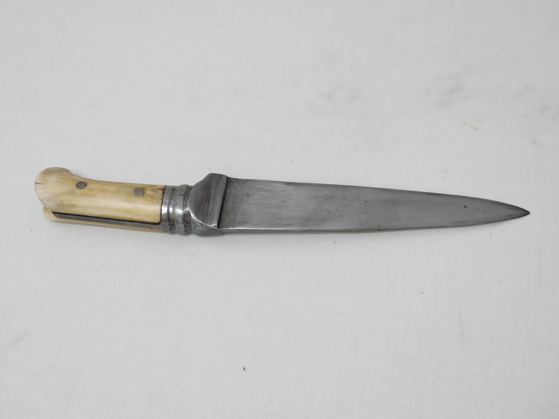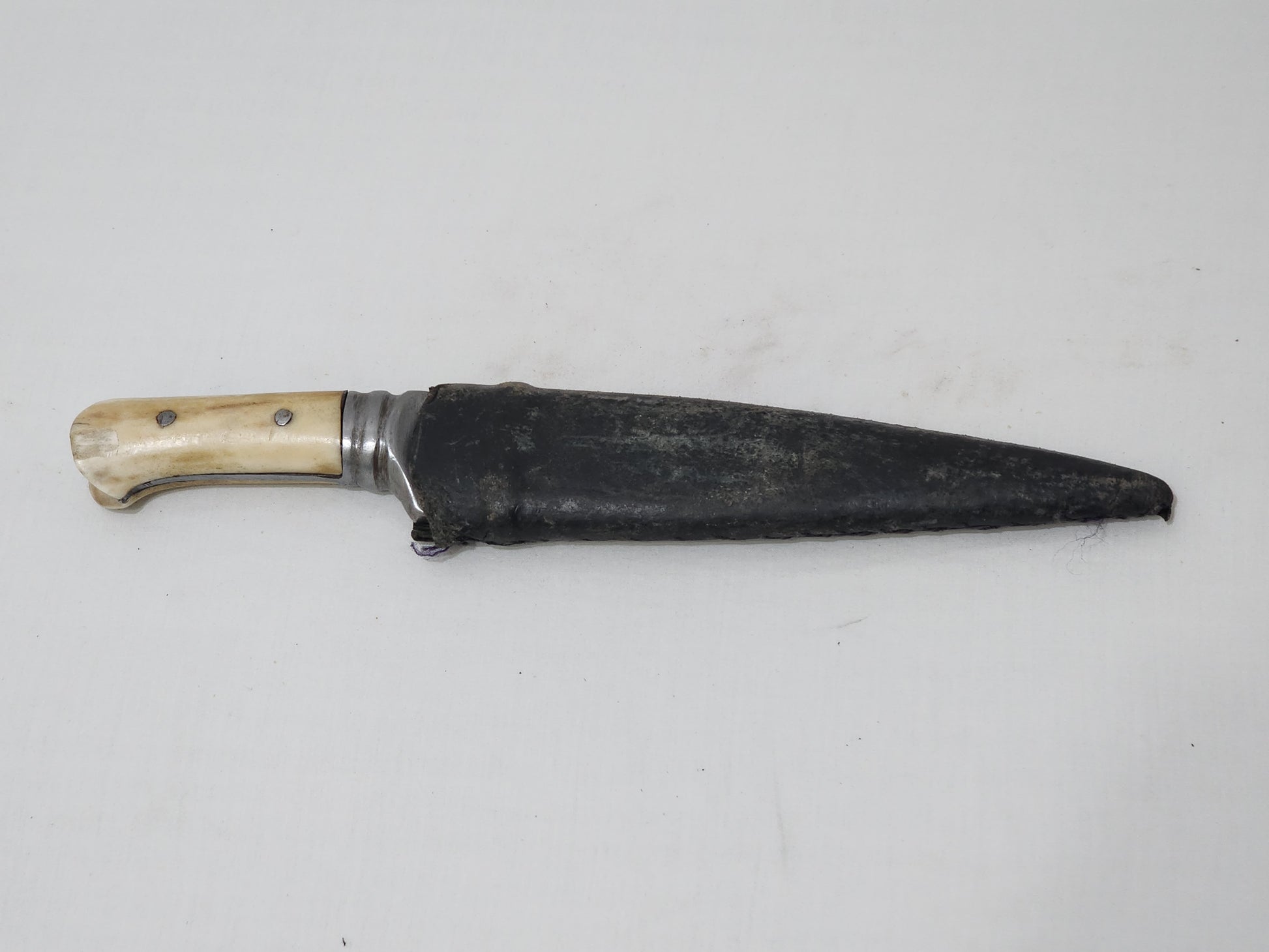 The blade is thick and made from a wootz sword blade. The last 7.5cm of the blade is double-edged. The blade is shaped as a spear head and married to a steel handle with deer antler ("Barasingha") scales. Designed to be balanced in the hand, it is ideal for training. A very solid piece. Comes with a modern scabbard with black leather.