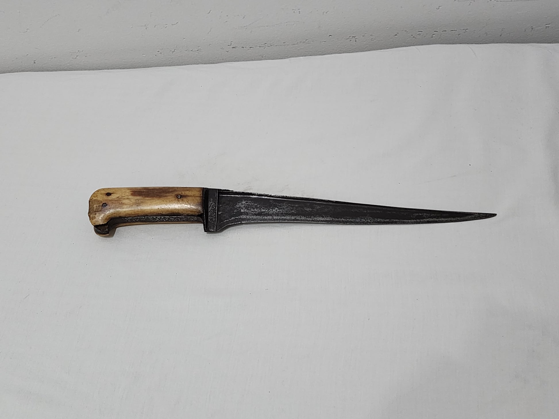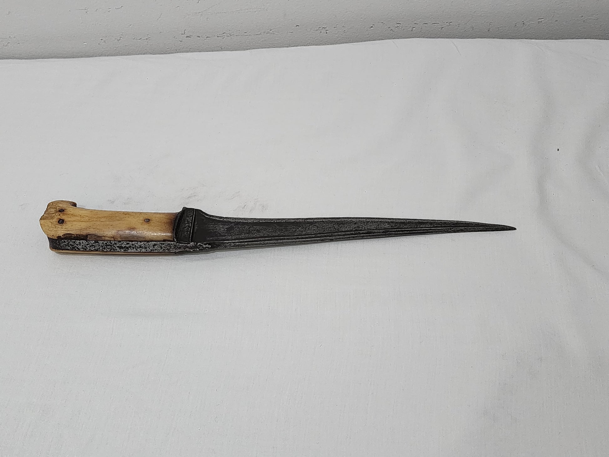 A Pesh Kabz dagger with a wootz blade. Patina typical of age. Scales are of bone, most likely camel; well riveted. A good example of a Pesh Kabz dagger from North India with a touch of influence from the North West Frontier. The solid T-section blade provides dexterity to the blade; there is a decorative chiselling on the spine. Edge remains clean, sharp and devoid of any nicks or damage. A very solid piece.