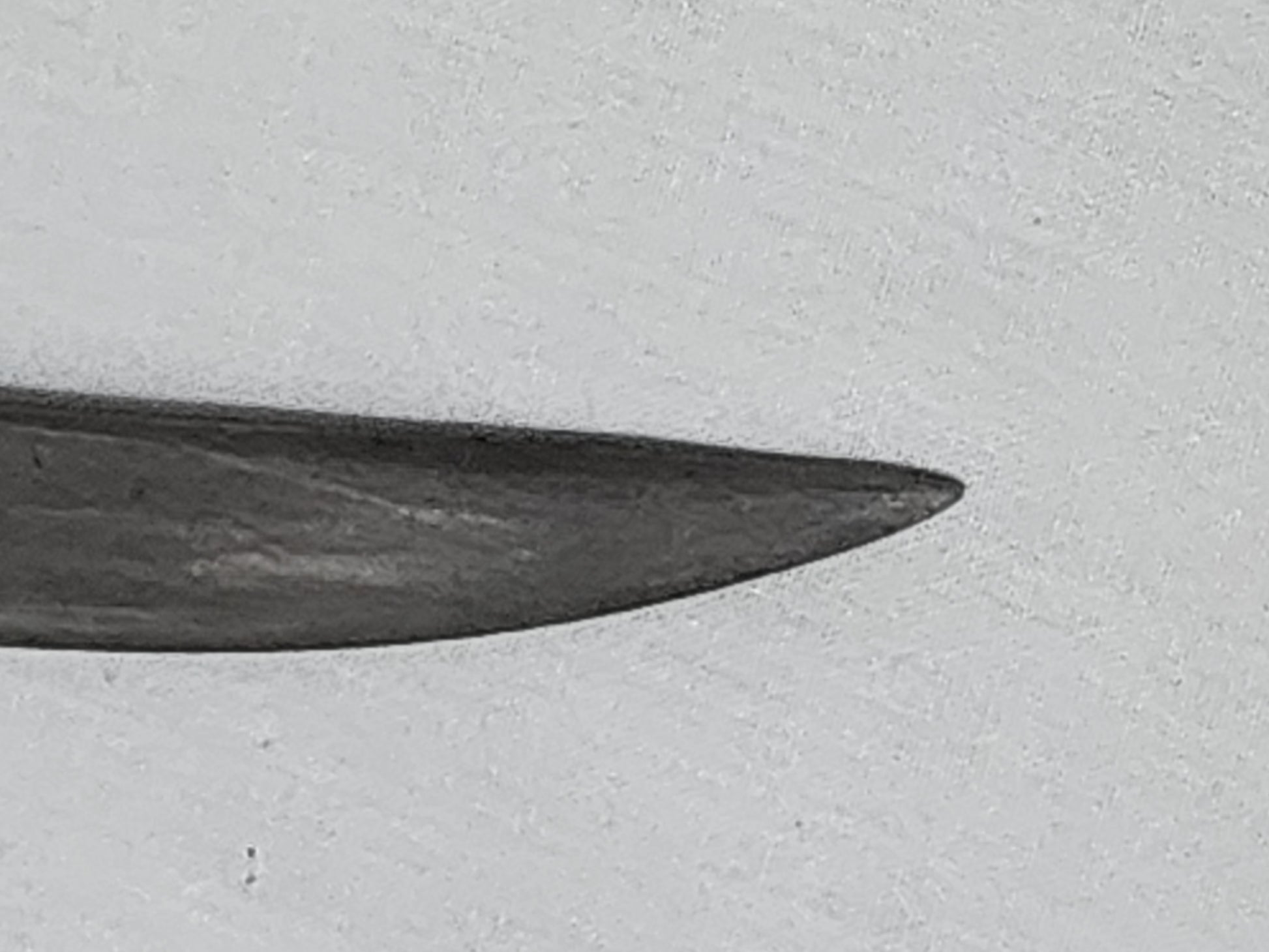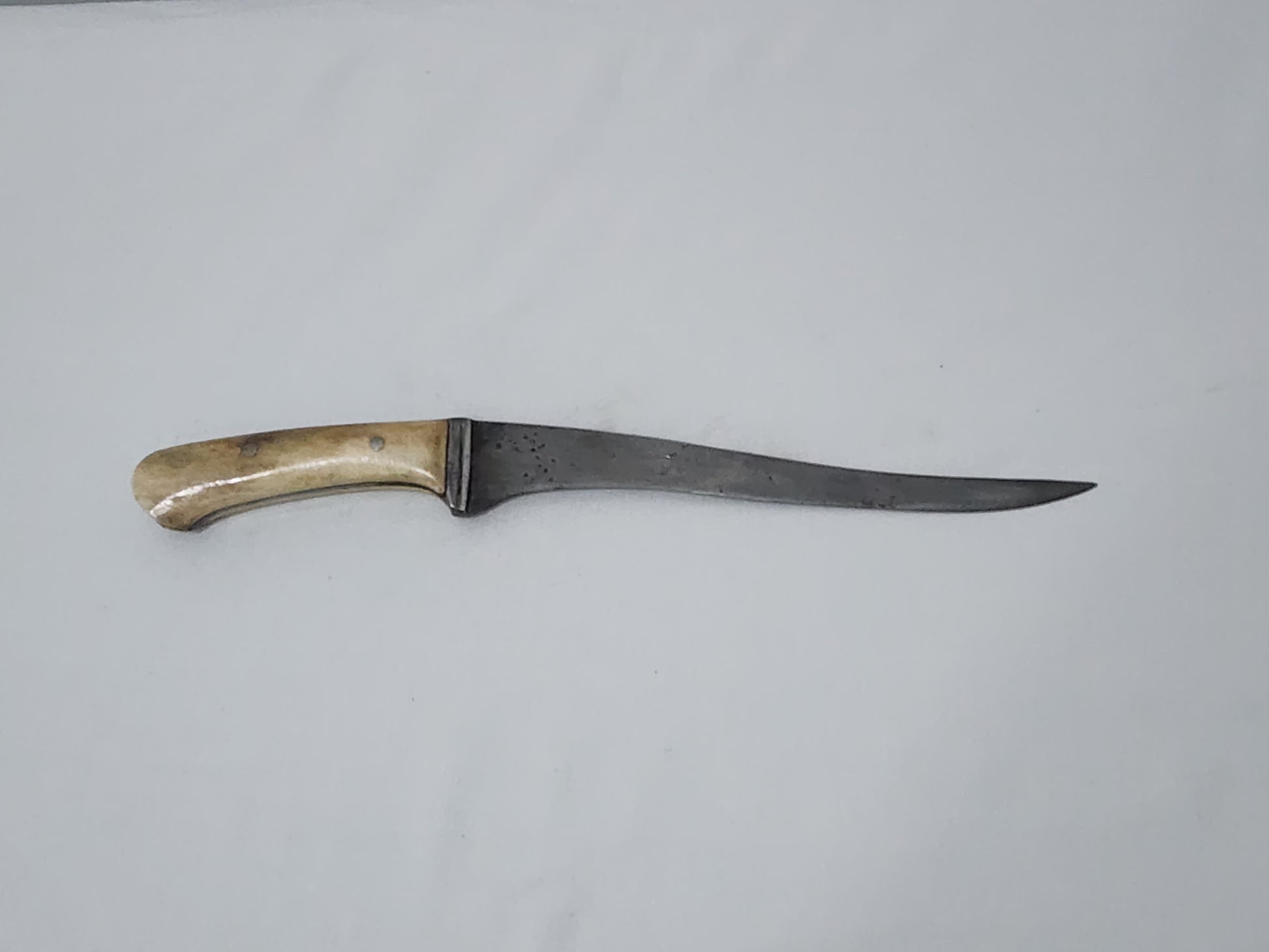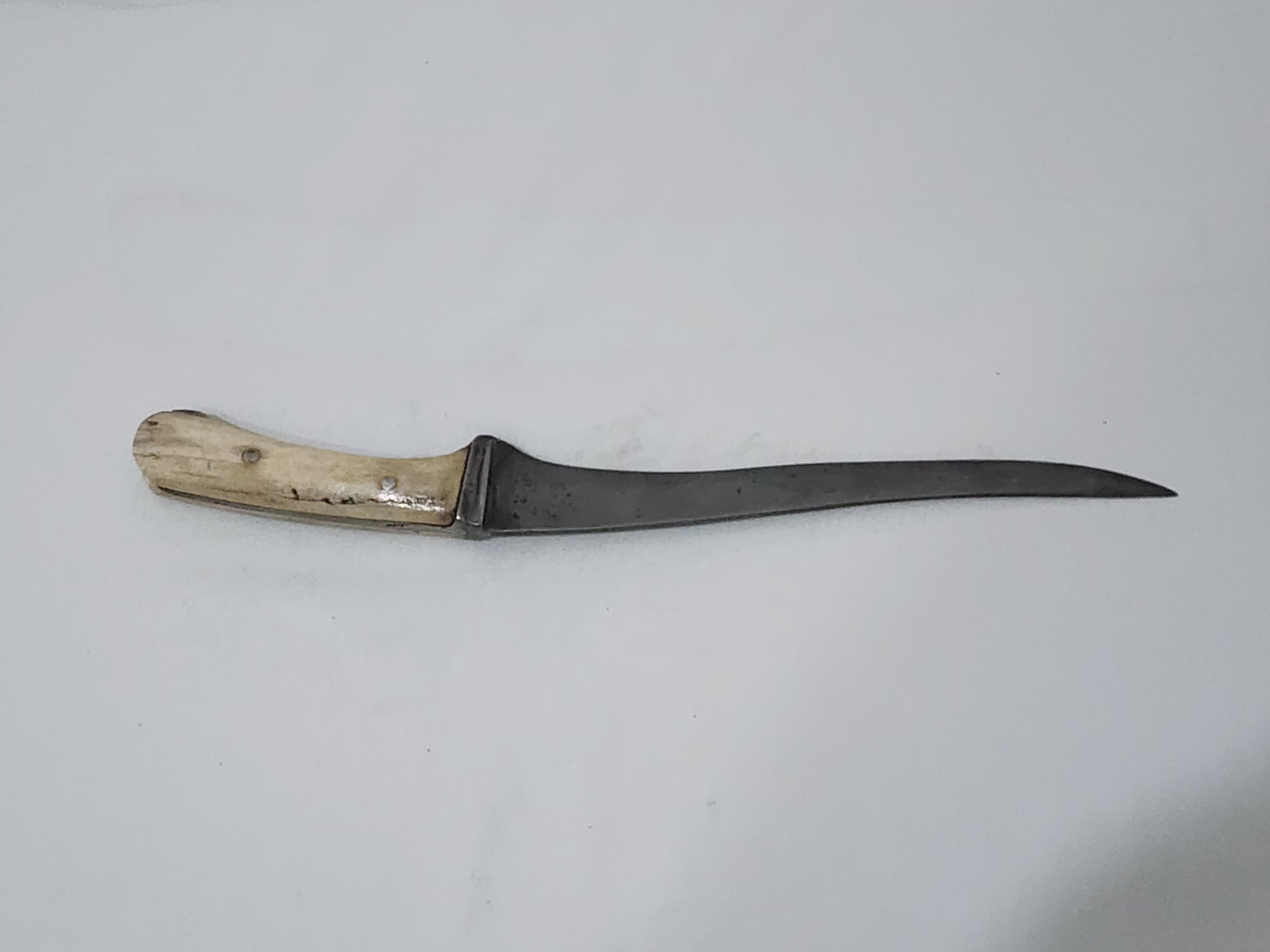 A Pesh Kabz dagger with a wootz blade. The blade has been fashioned from an old wootz sword blade and is married to a steel hilt; the scales are or deer antler ("Barasingha"). The solid recurve blade provides fantastic dexterity to the blade. Edge remains clean, sharp and devoid of any nicks or damage. A very solid piece, designed to be balanced in the hand; ideal for training.