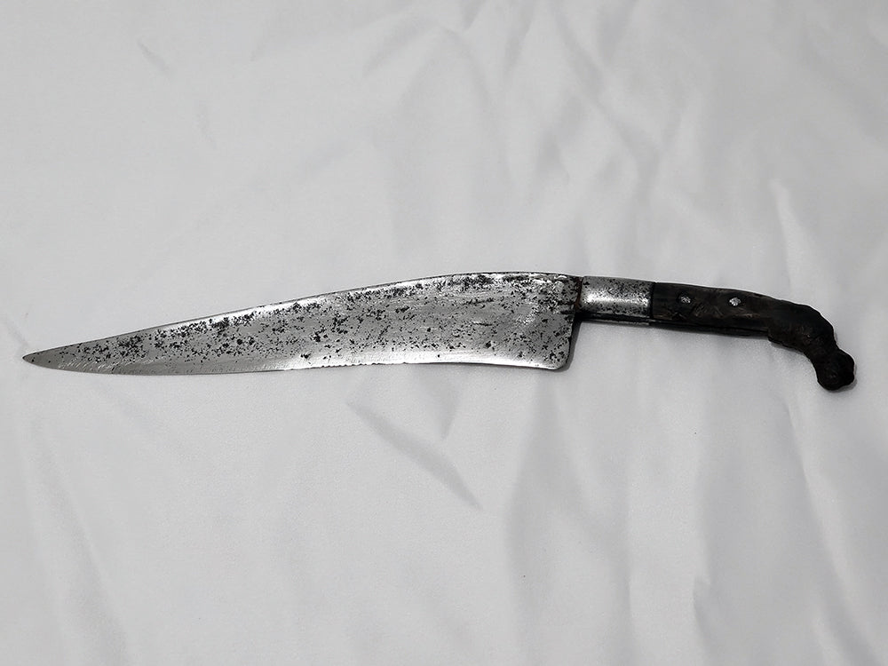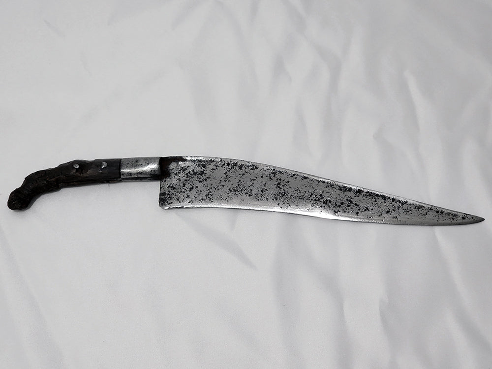 A fantastic fighting Choora knife from Jaipur. The sharp blade appears most likely to be of pattern welded steel with a horn hilt. A very well balanced blade with a T-section; minor pitting on the blade but it does not affect the integrity of the item. The unusual shape of the hilt actually allows for the blade to sit very well when held correctly. In Sanatan Shastar Vidiya, blades are never gripped hard or clenched but braced to allow maximum dexterity. The spine of the blade is solid as is the hilt. The sharp edge is beveled and the blade is designed for both stabbing and cutting; this item has not been shaved down or reshaped. No movement in the handle and the scales are very well riveted. A very solid knife typically kept as a daily "personal" item in the waist belt.