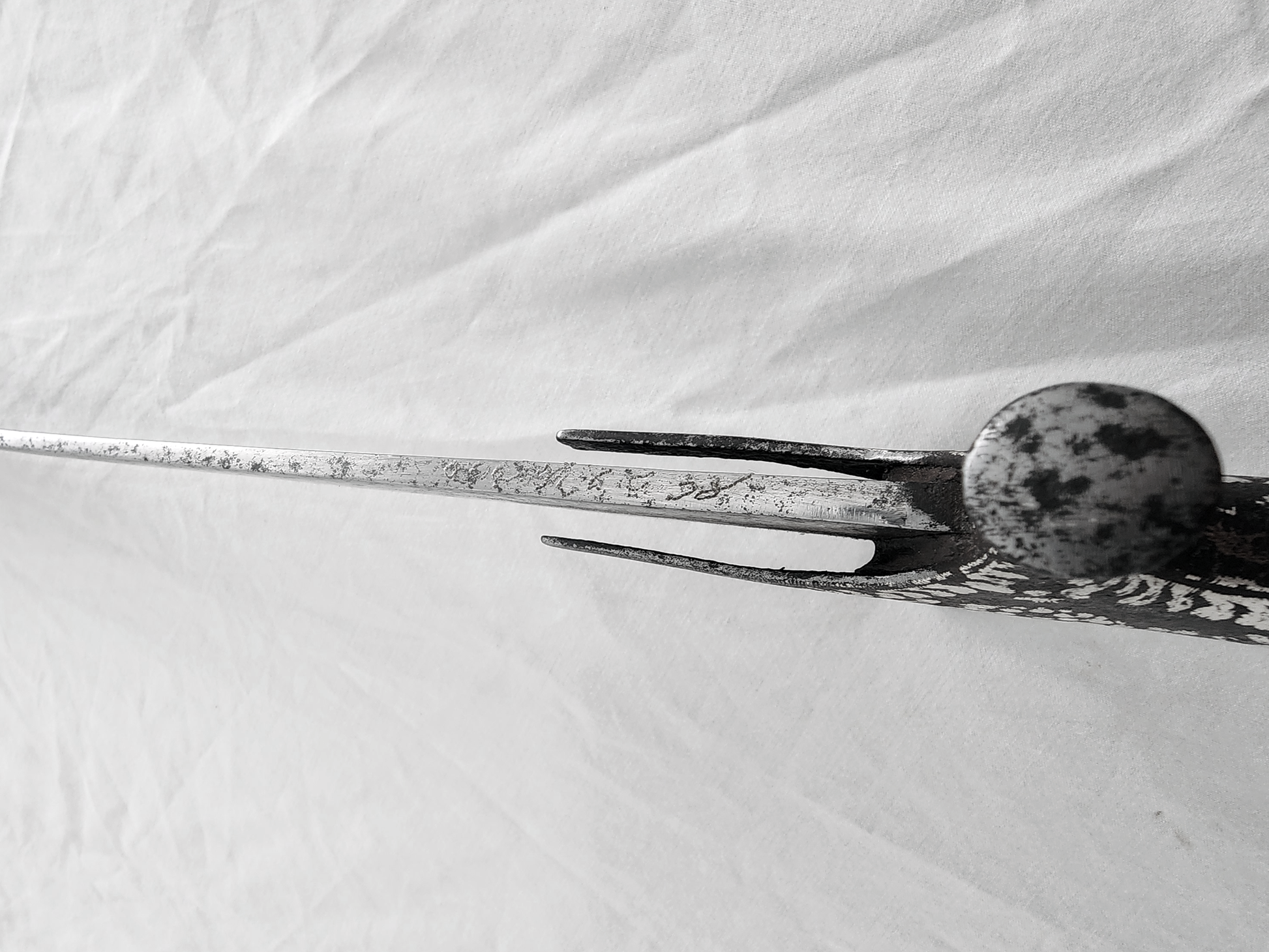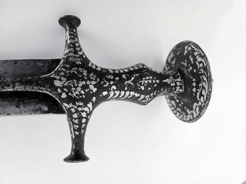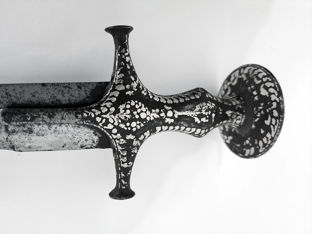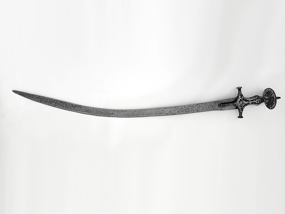 The blade has an armoury inventory mark on the spine close to the hilt, typical of high-end swords; most likely Bikaner or Ajmer given the style of the hilt and sword shape.